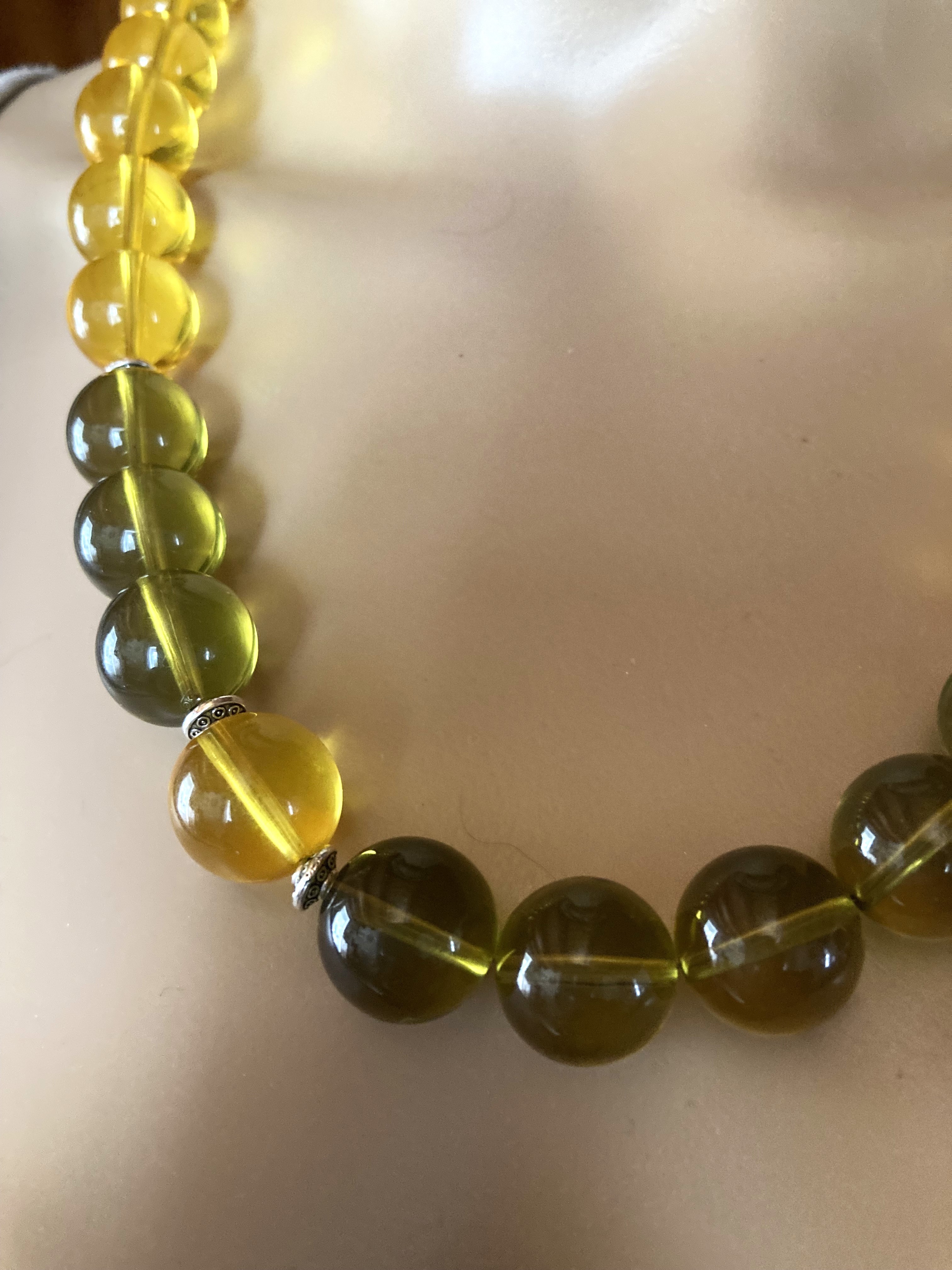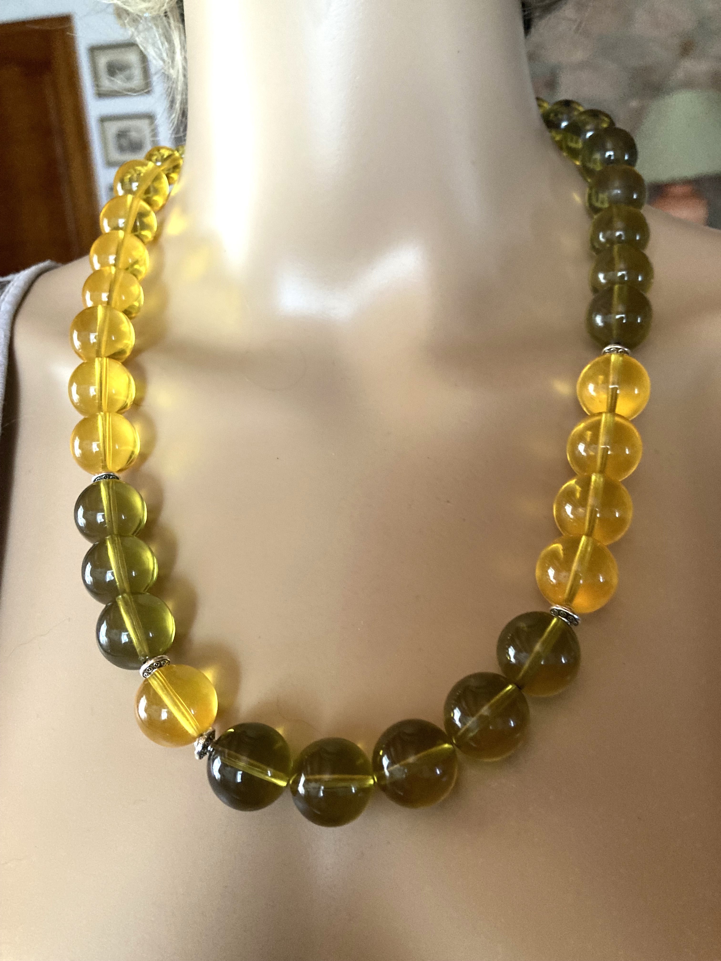 Très beau collier en ambre vert, et ambre miel clair. Bijou femme.