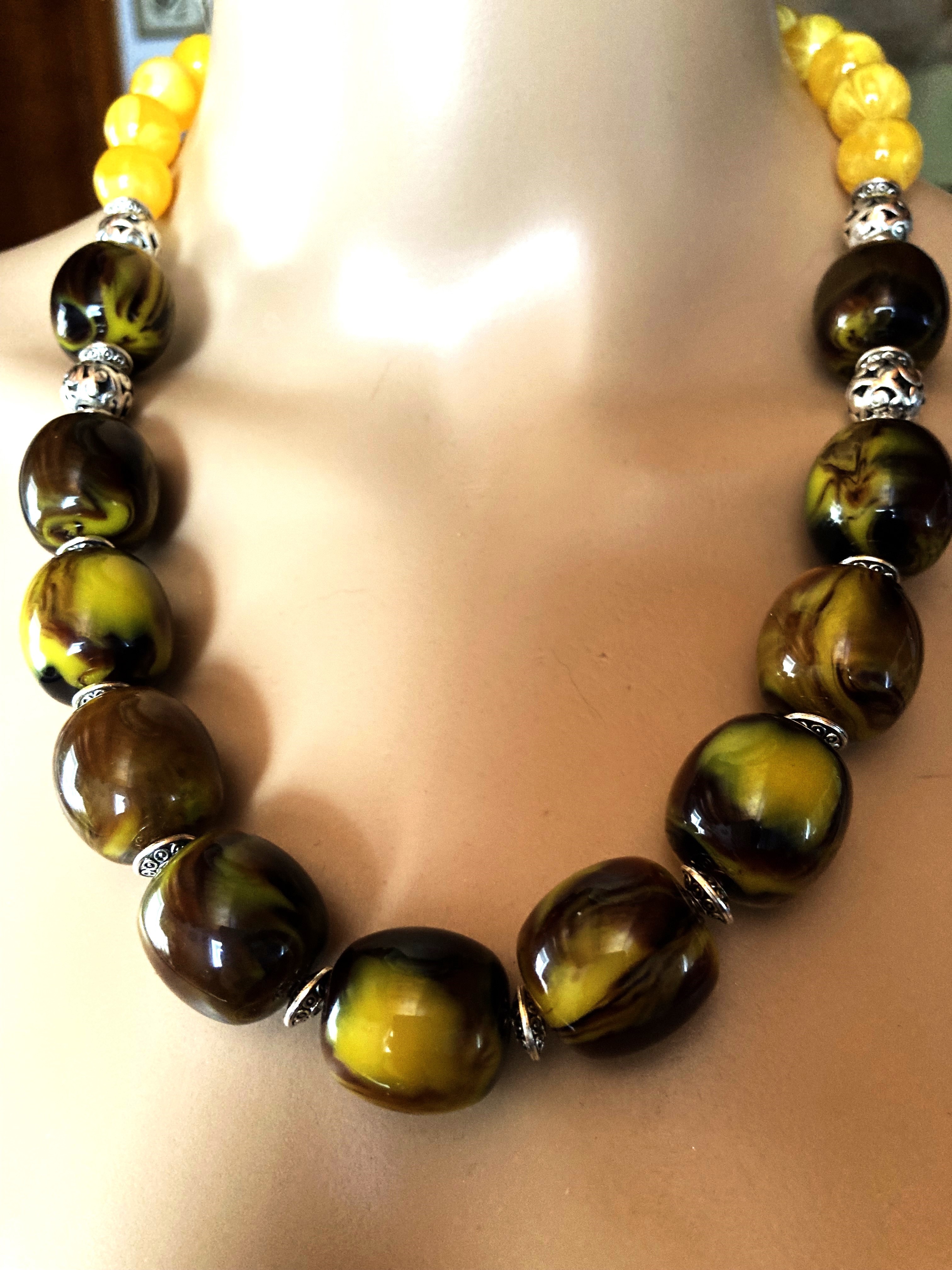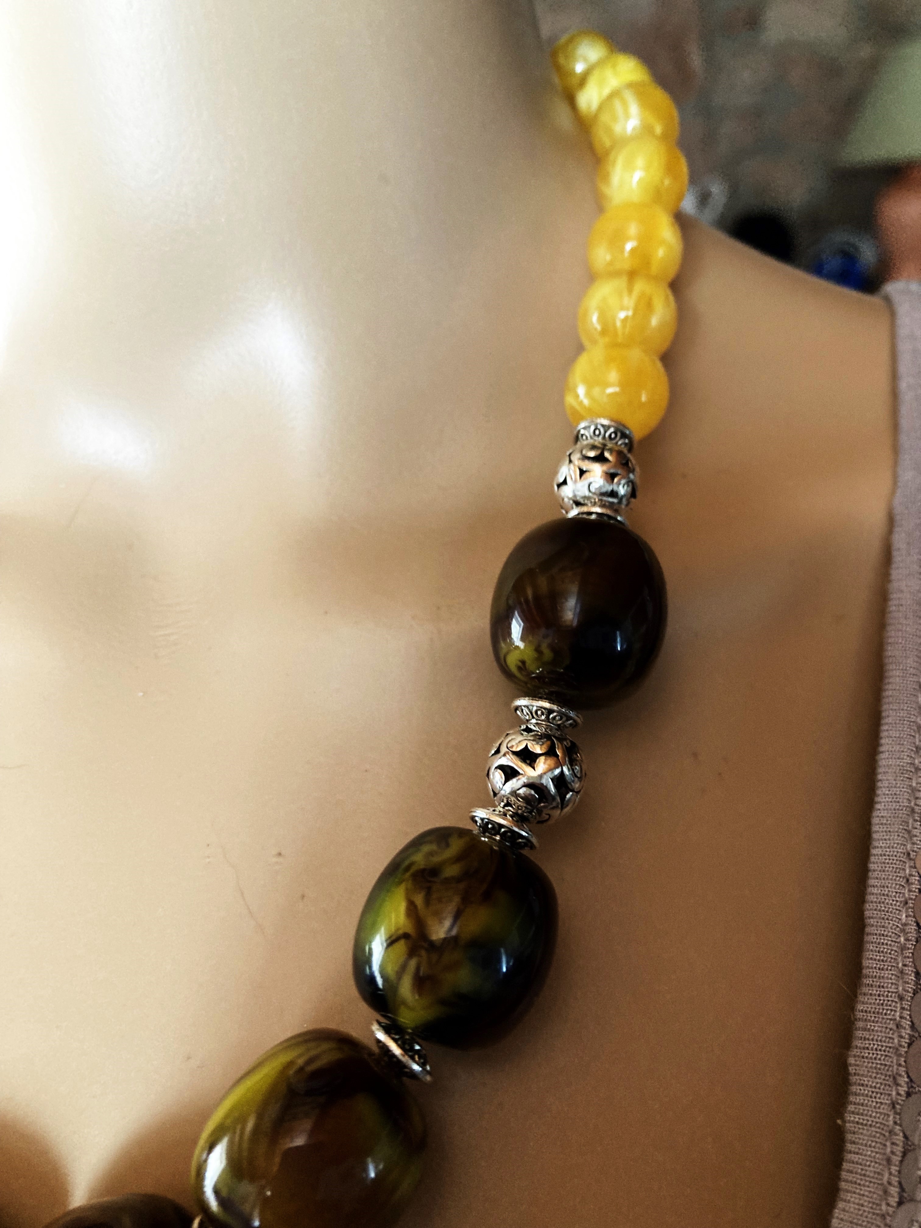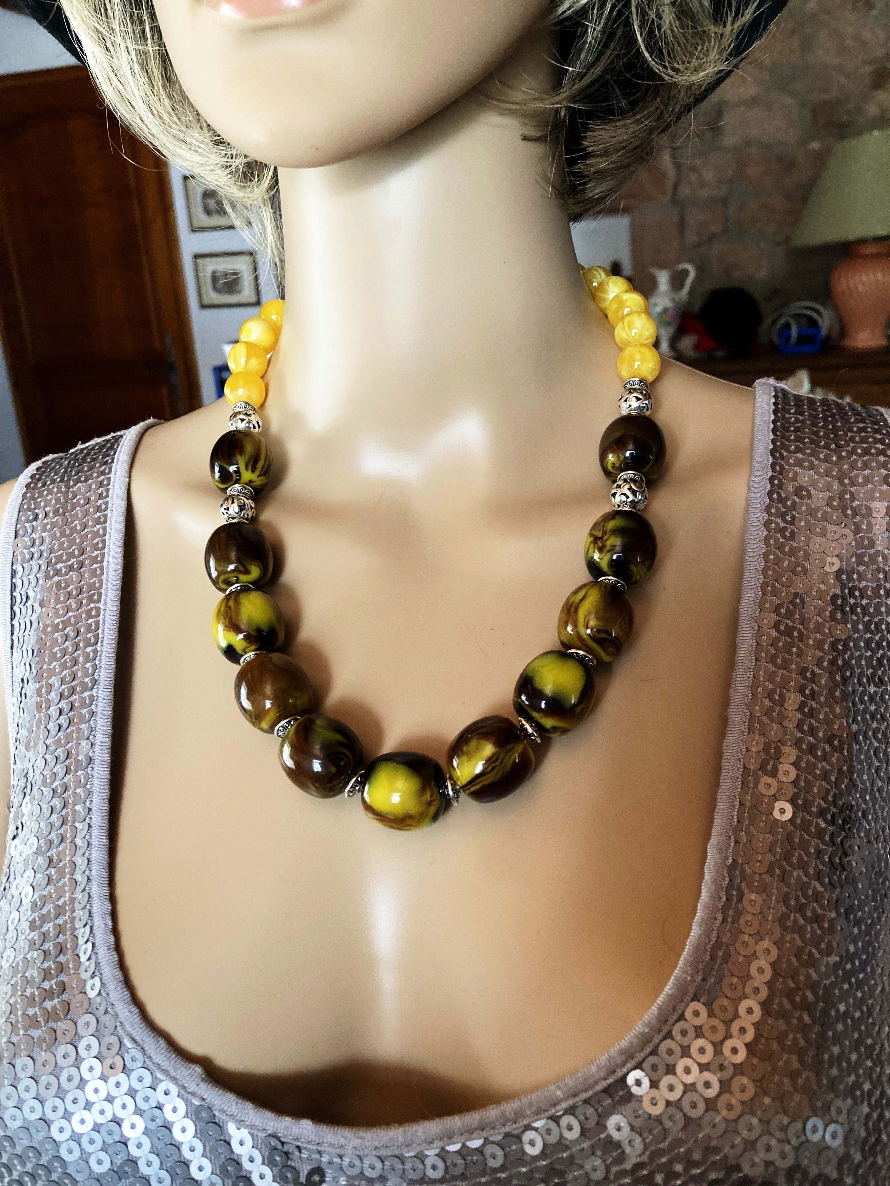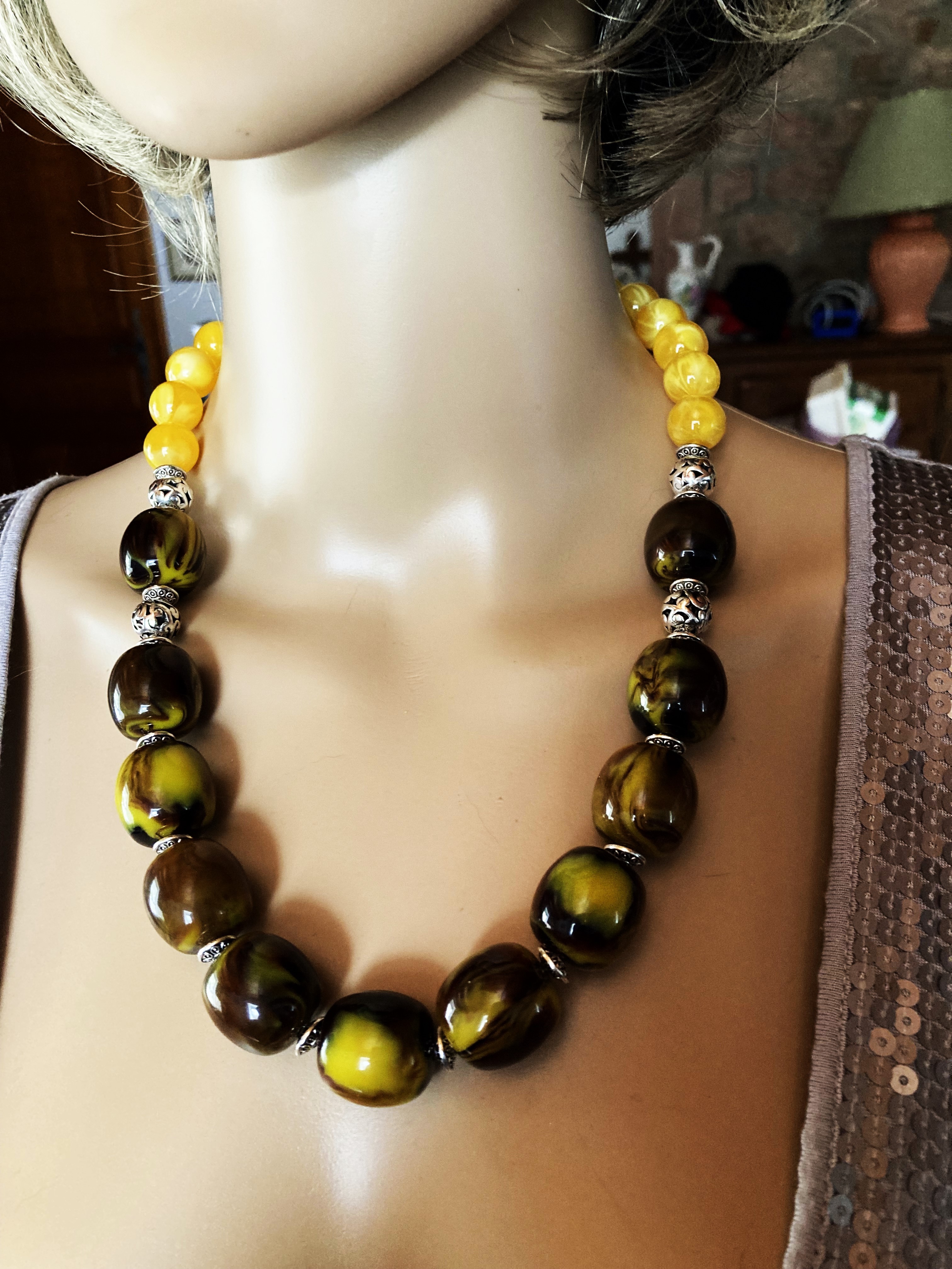 Ambre jaune et ambre marron/jaune très marbré collier 57 cm grosses perles de 20mm et 14mm Bijou femme. Grosses perles d'ambre marron/jaune très marbré, rondes de 20mm à la base et perles d'ambre jaune, rondes de 14mm avec en intercalaires des perles ciselées en argent tibétain.