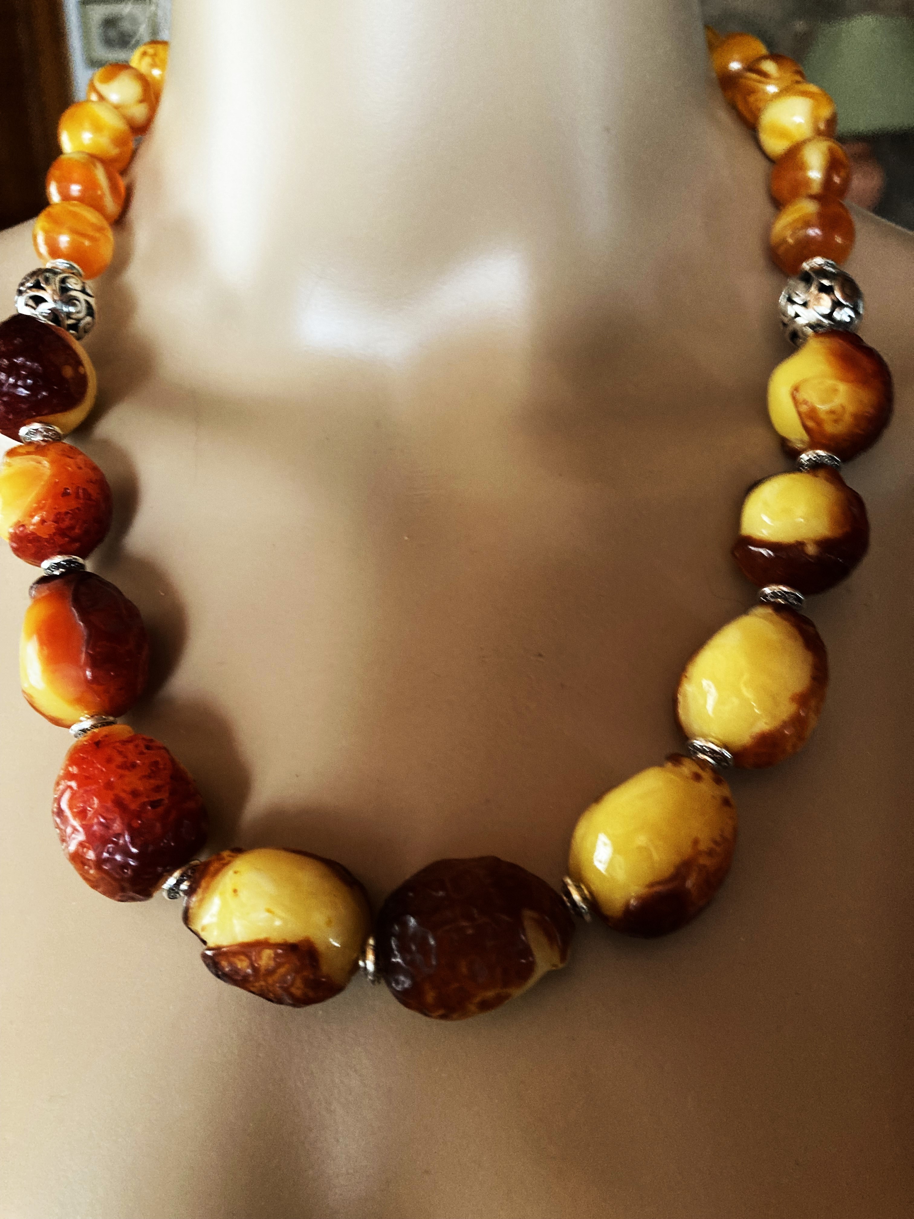 RARE glands fossilisés à moitié ouverts, superbe collier, ambre orange marbré jaune. Bijou femme.