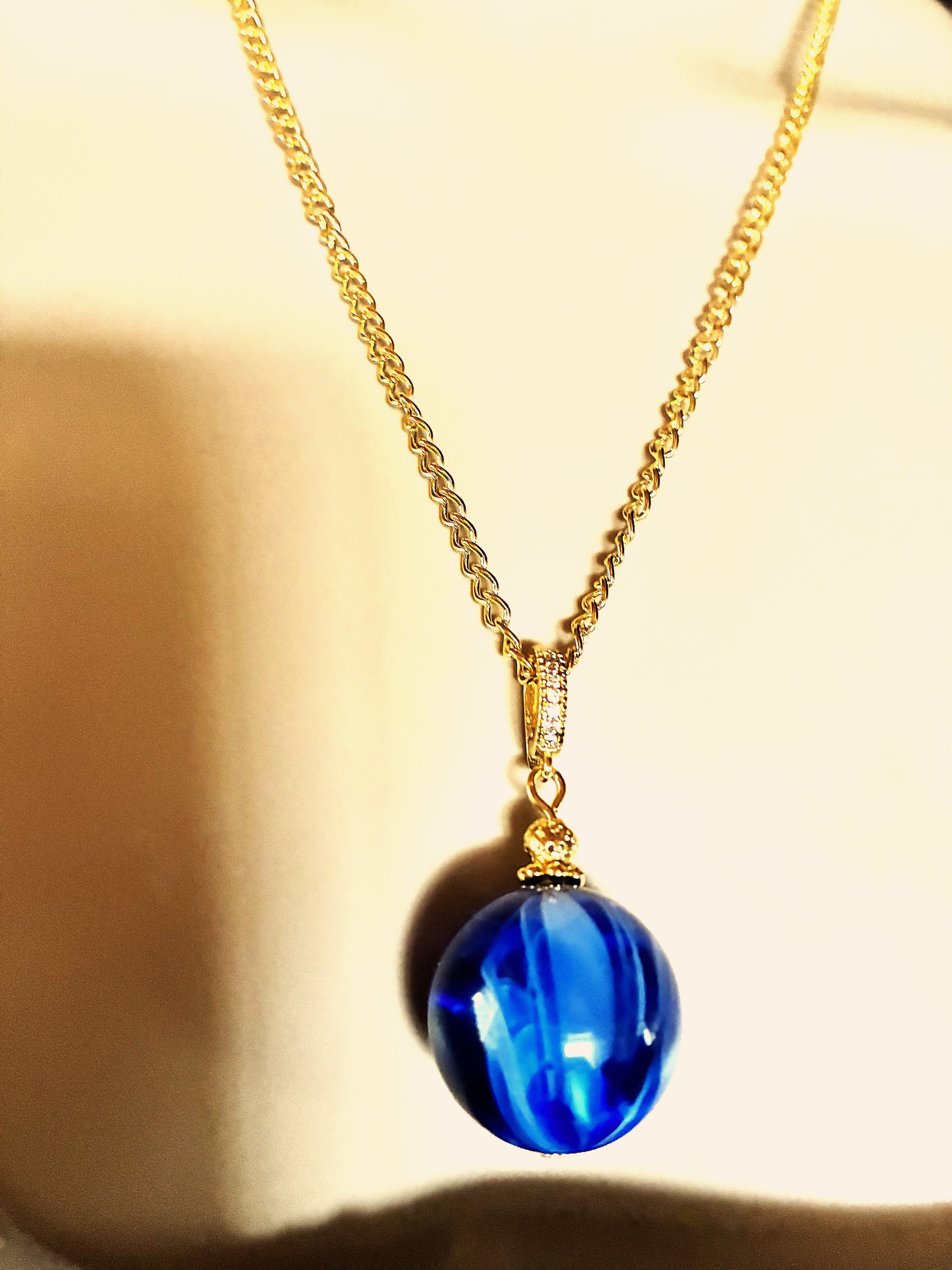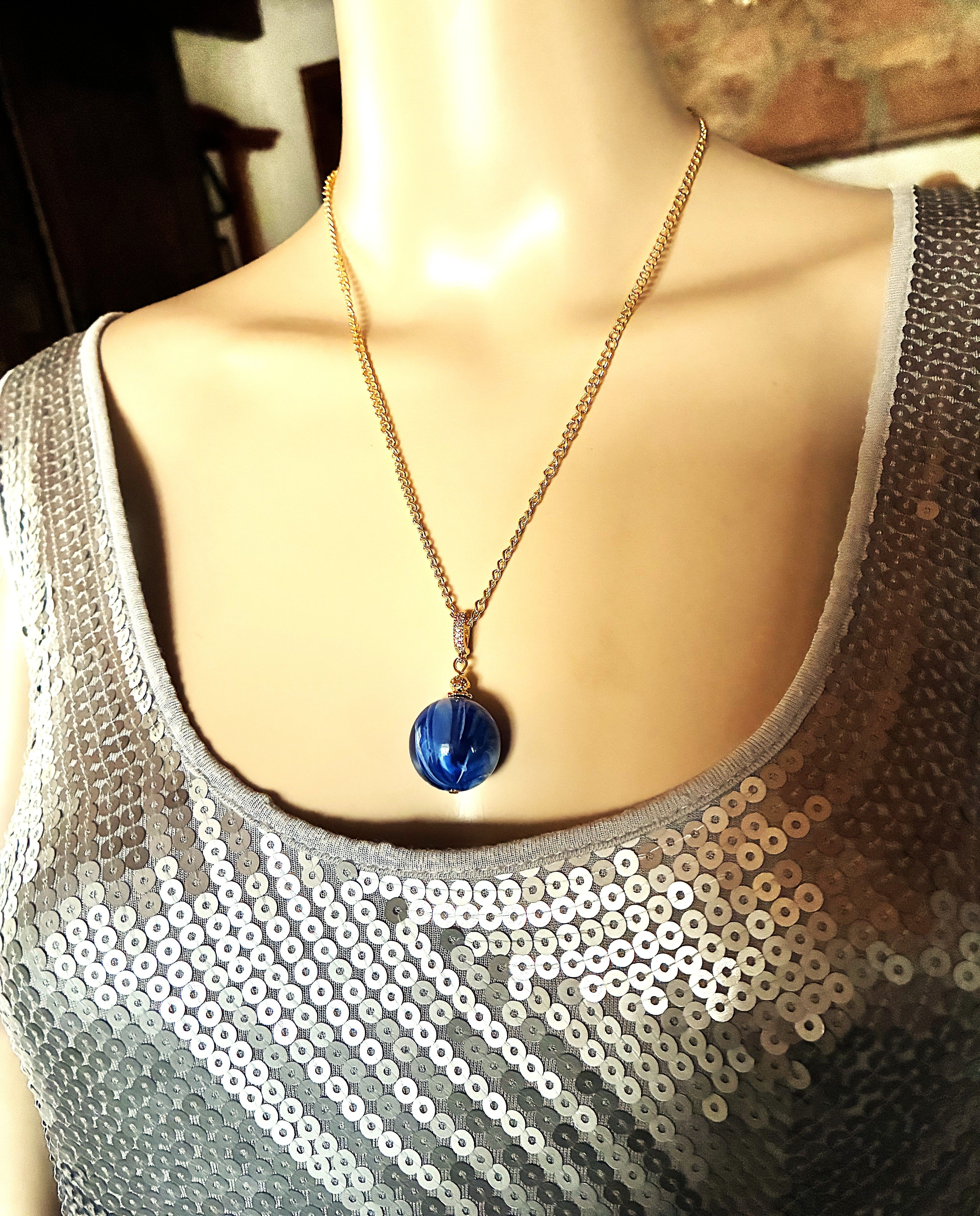 Très joli pendentif en ambre bleu, magnifique Perle ronde en ambre bleu marbré de 20 mm avec une très jolie bélière dorée. Jolie chaîne de 50 cm en acier inoxydable dorée, fermée par mousqueton. N'hésitez pas à me contacter pour une autre dimension. Livré dans une jolie pochette en organza, prêt à offrir.