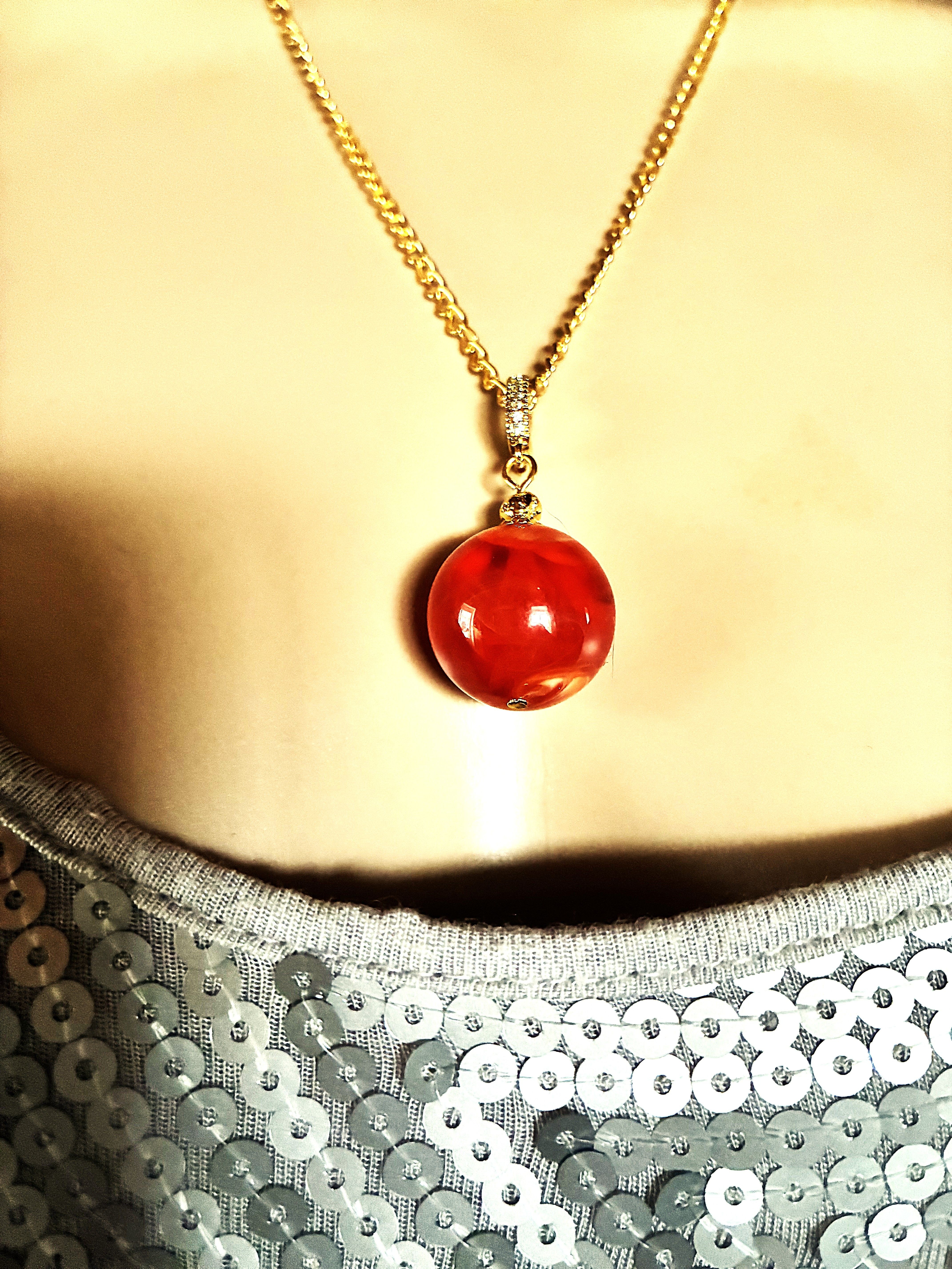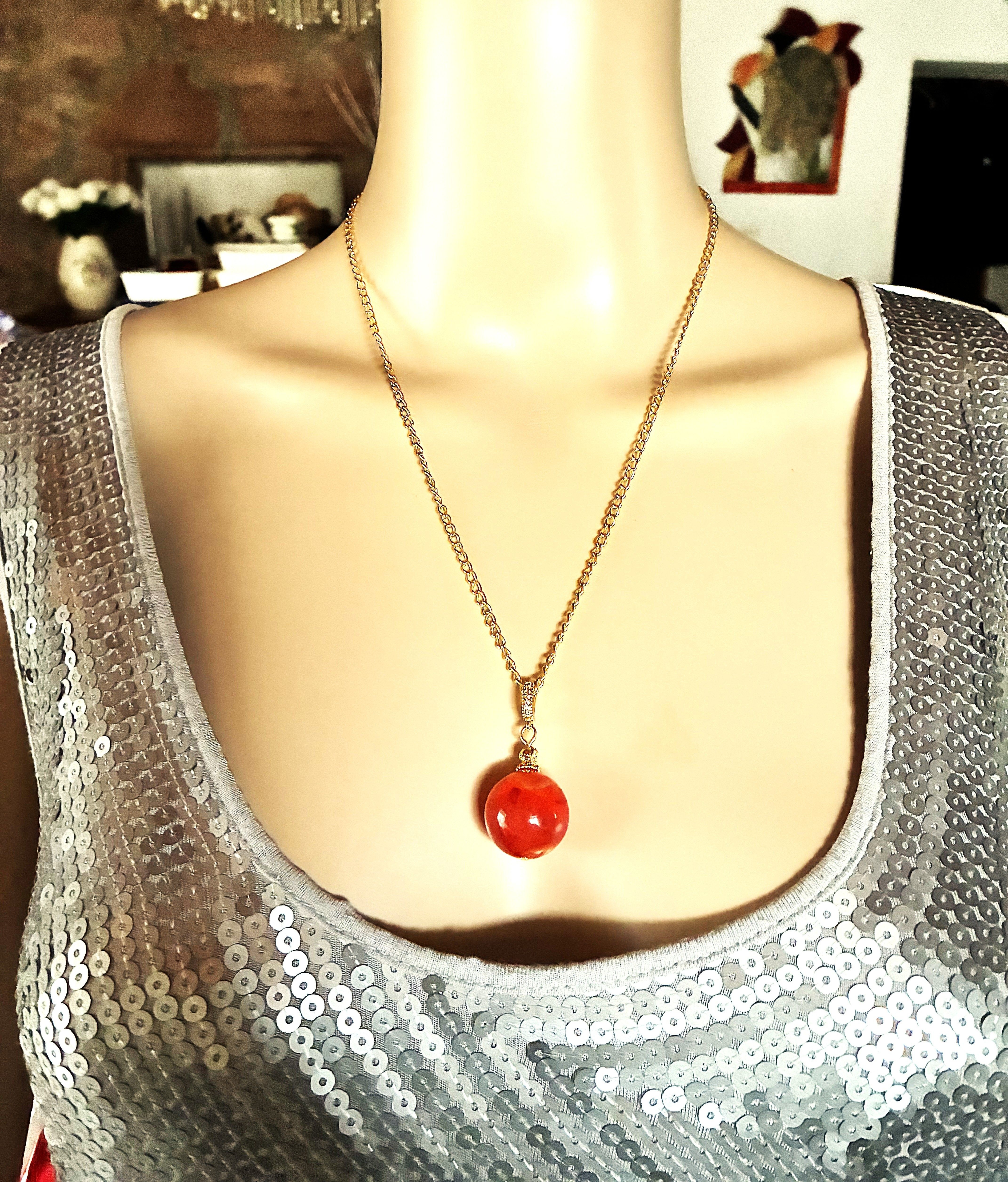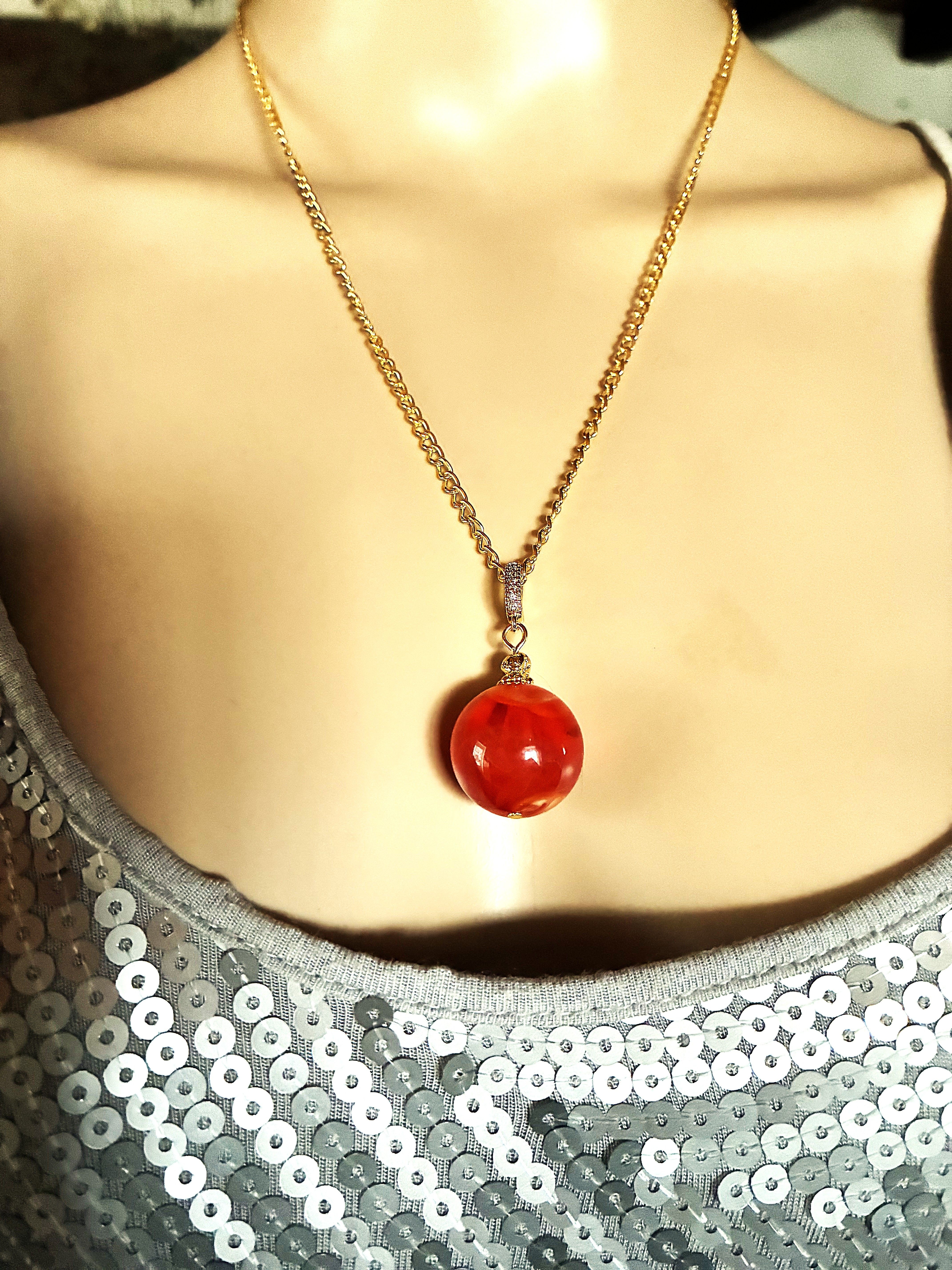 Très joli pendentif en ambre orange, magnifique Perle ronde en ambre orange marbré de 20 mm avec une très jolie bélière dorée. Jolie chaîne de 50 cm en acier inoxydable dorée, fermée par mousqueton. N'hésitez pas à me contacter pour une autre dimension. Livré dans une jolie pochette en organza, prêt à offrir.